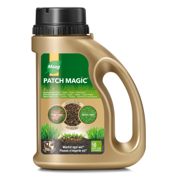 Le réparateur 4 en 1 du gazon avec semences, engrais, produit fixateur et substrat de germination pour les endroits dénudés du gazon.