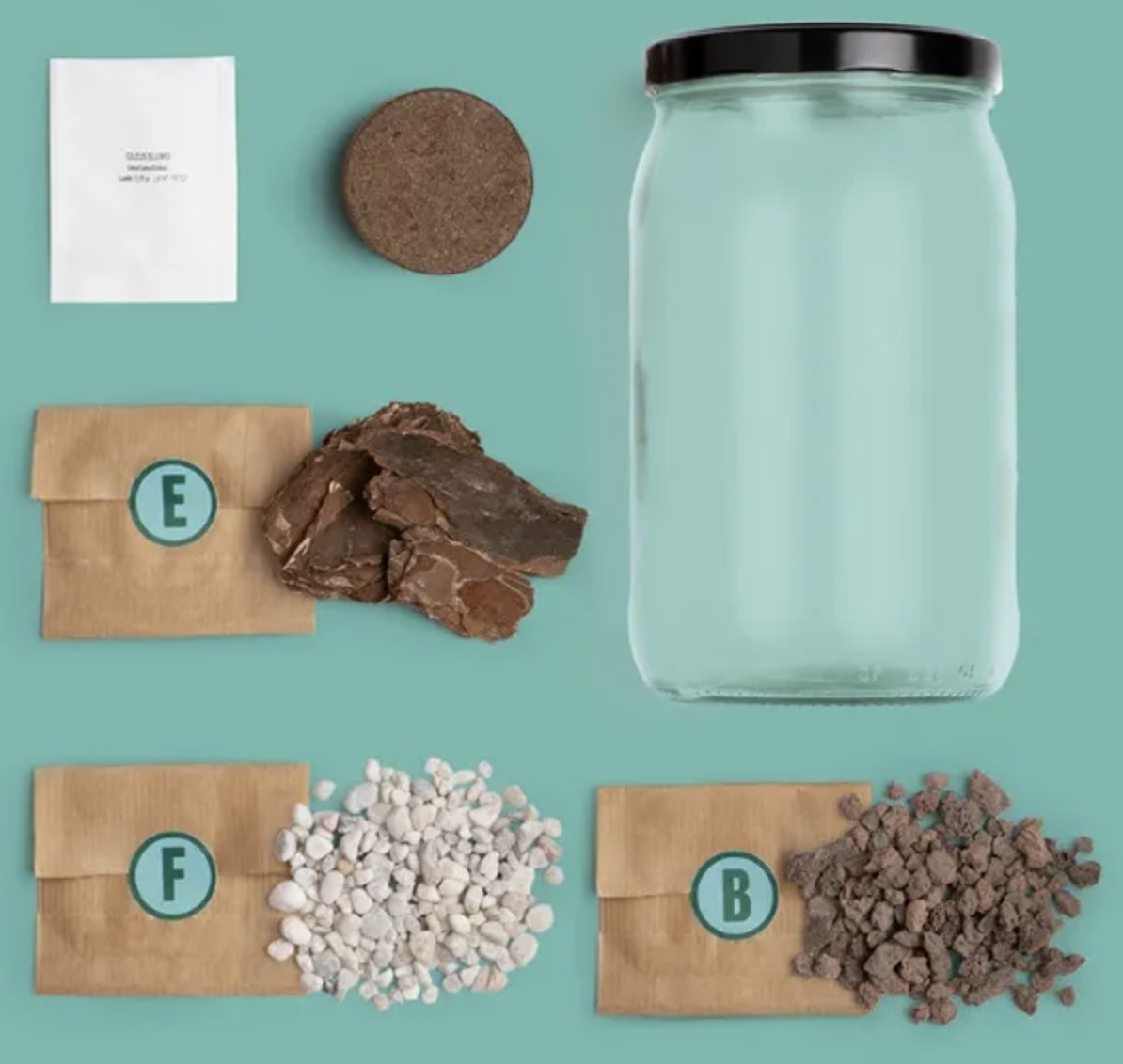 Le kit comprend : 1 bocal en verre, 1 sachet de graines de coléus, 1 pastille de substrat, du gravier volcanique, du gravier blanc et de l’écorce de pin.